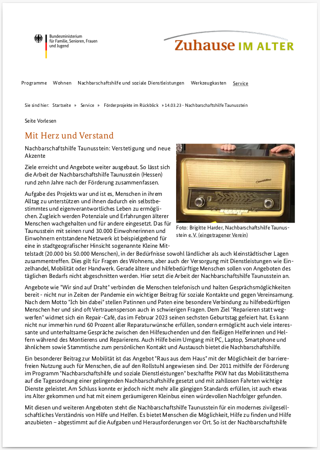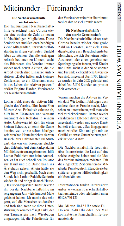 In unserem Presseportal informieren wir Sie über aktuelle Themen der Nachbarschaftshilfe Taunusstein. Neben Zeitungsberichten lesen Sie Presseinformationen und finden hier auch das neue Magazin unseres Vereins.