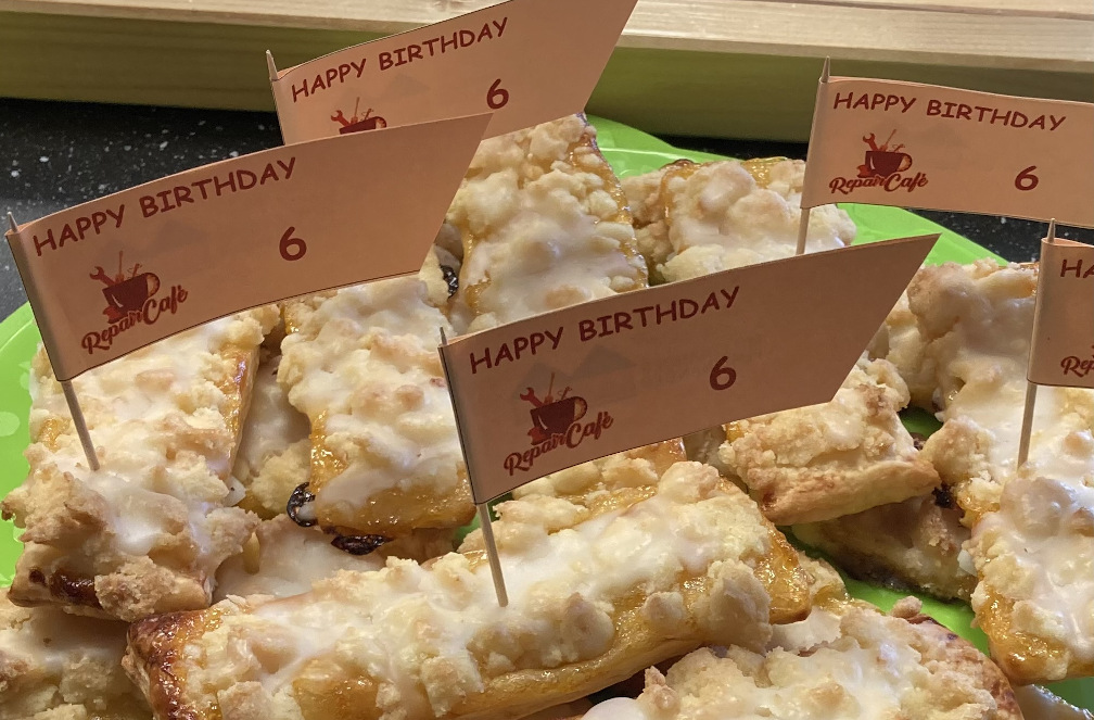 Das Café Team konnte stolz auf die dem Anlass entsprechend gelungene Kuchenauswahl blicken. Die Bäckerinnen und Bäcker hatten sich besonders viel Mühe gegeben. Die Gäste im Café waren begeistert, nicht nur der von der Kaffee Manufaktur in Wehen gesponserte leckere Kaffee, sondern besonders die tollen Kuchen trugen zur echten Geburtstagsstimmung bei. Seit dem Start wurden bereits 234 Kuchen ausgegeben, alle selbst gebacken und gesponsert von Unterstützer:innen des Repair Cafés.