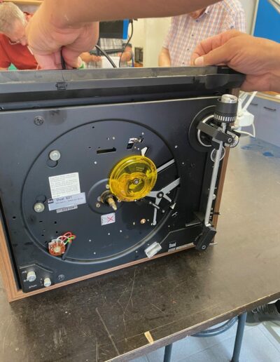 Wieder waren viele Gegenstände ins Repair-Café gebracht worden und die Reparierer gaben ihr Bestes. Auch die schöne alte Musiktruhe wurde instand gesetzt.