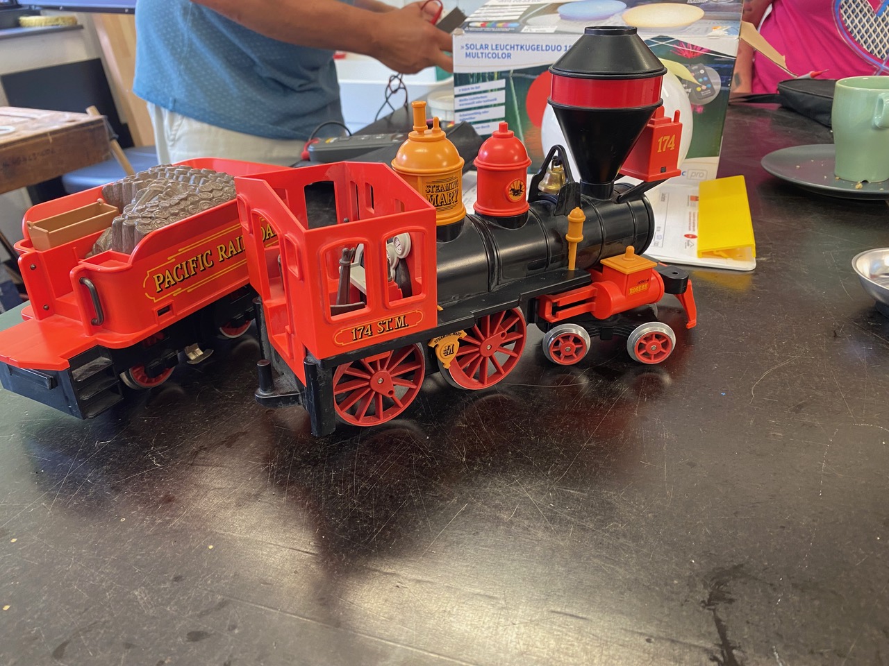 Auch diesmal gab es wieder einiges Ungewöhnliches zu reparieren. Neben den gebräuchlichen Gegenständen wie Lampen, Nähmaschinen und etlichen Küchenmaschinen gab es einen Tischgrill, einen Ventilator aus frühen Jahren, mehrere Plattenspieler – ein Besucher meinte, das sei bestimmt wegen des Rheingauer Musikfestivals – und eine große elektrische Eisenbahn der Union Pacific, die wahrscheinlich einen Überfall nicht so gut überstanden hat.
